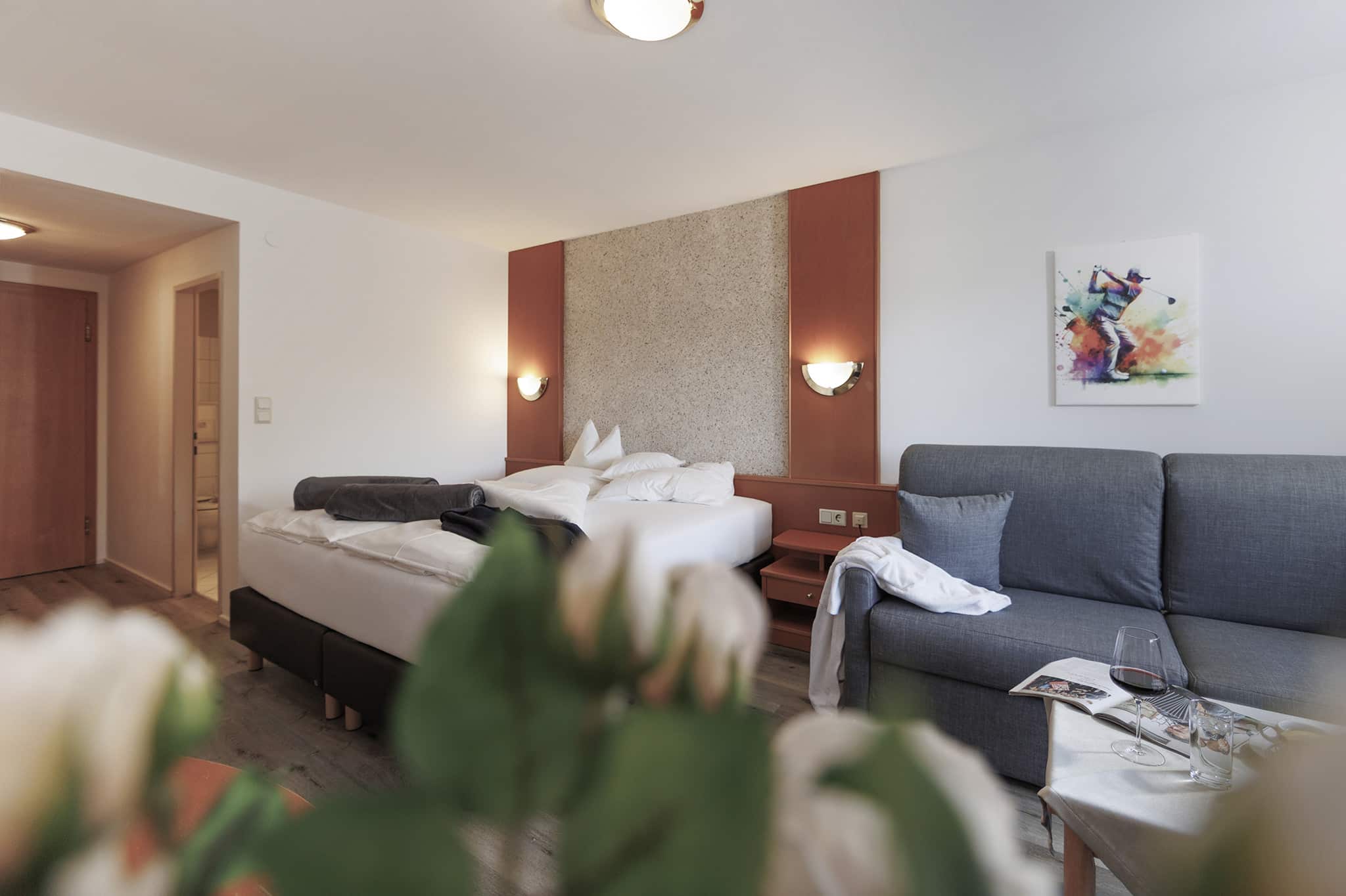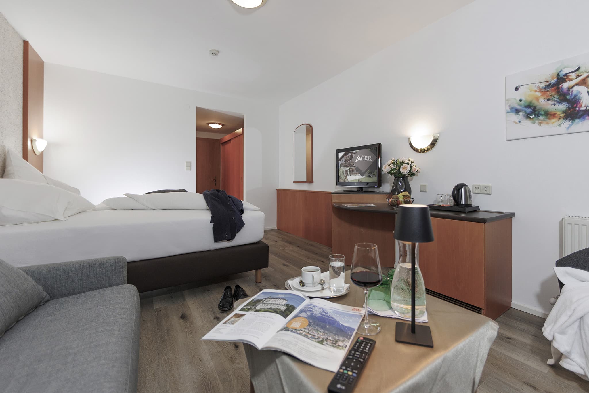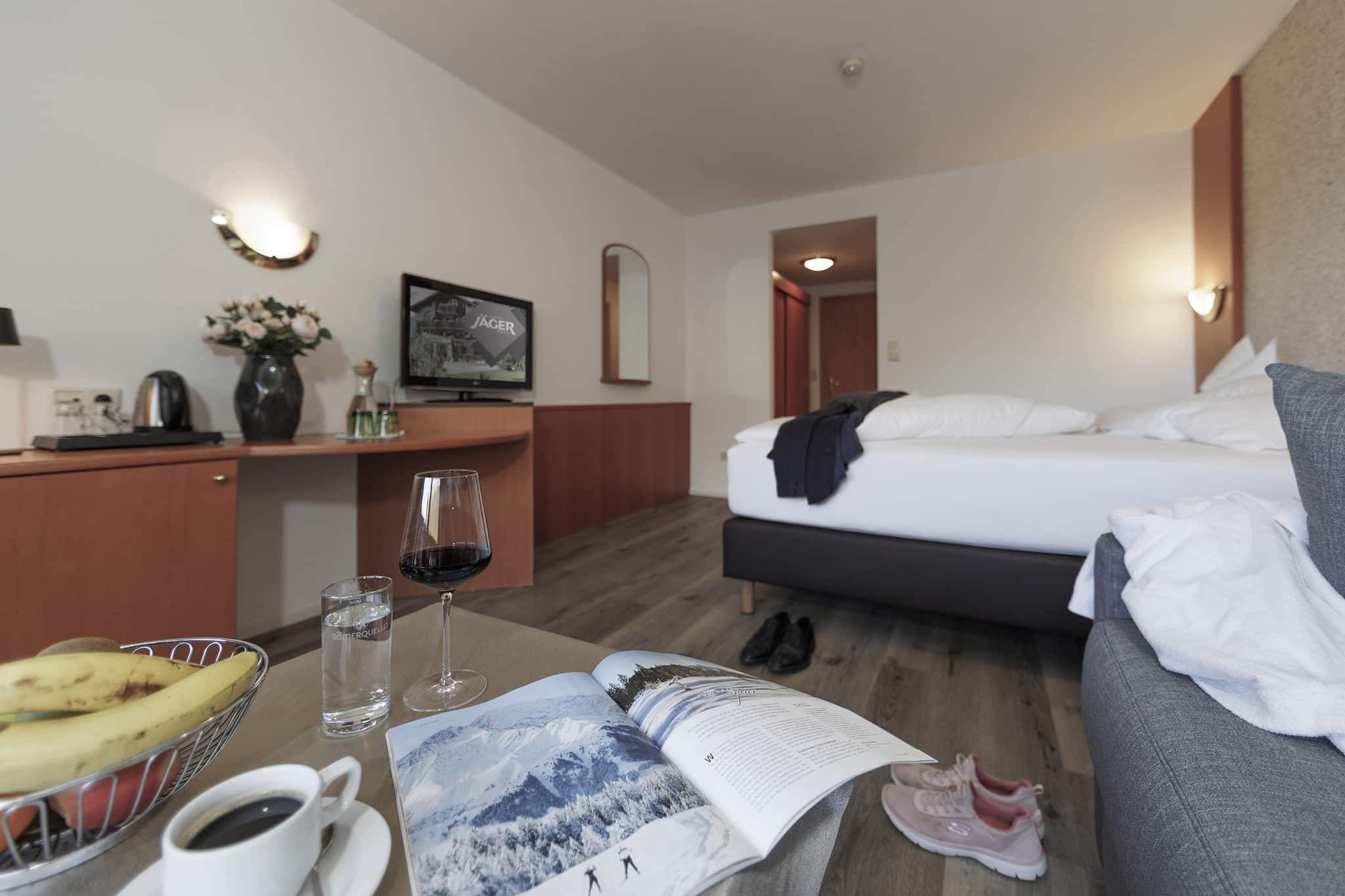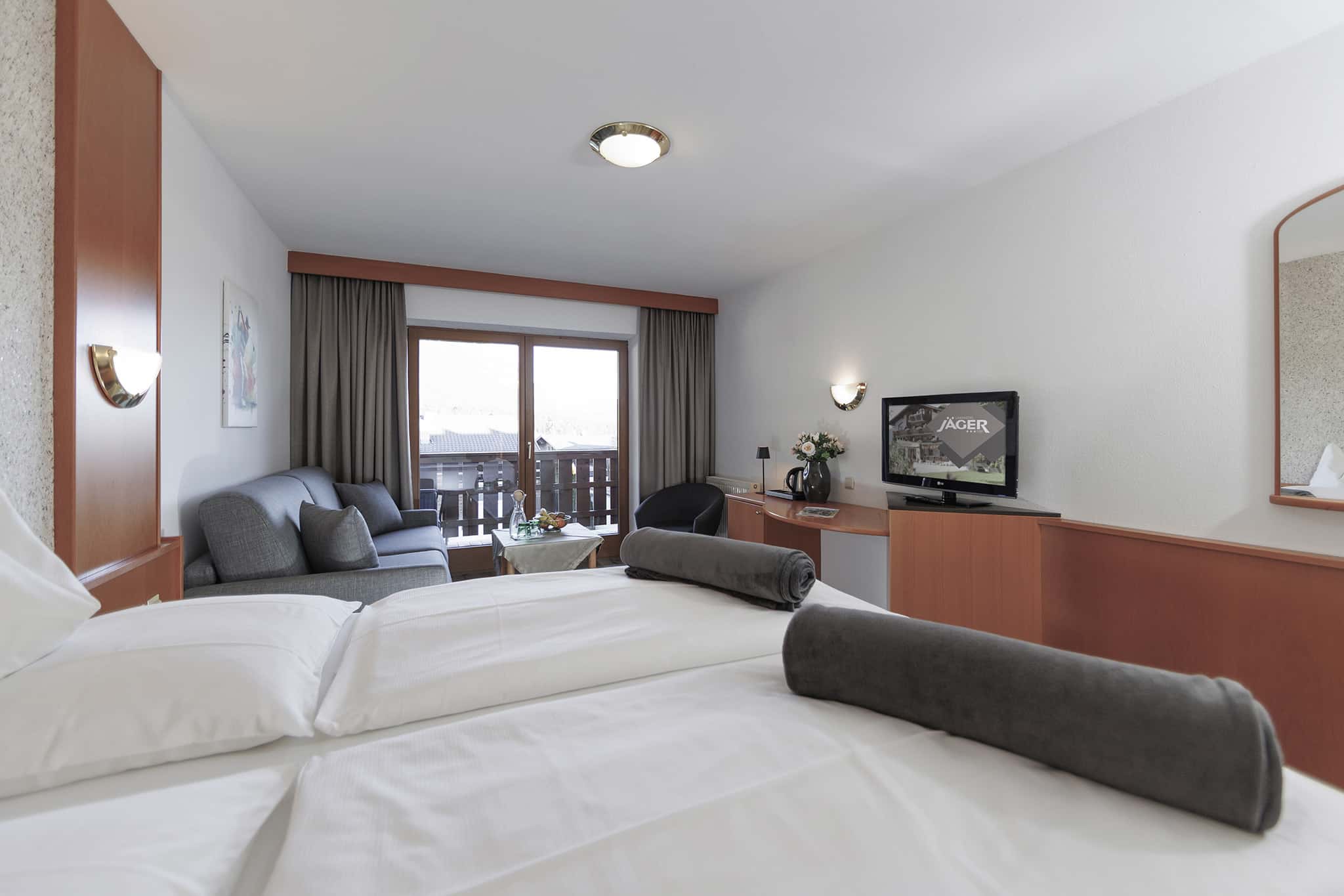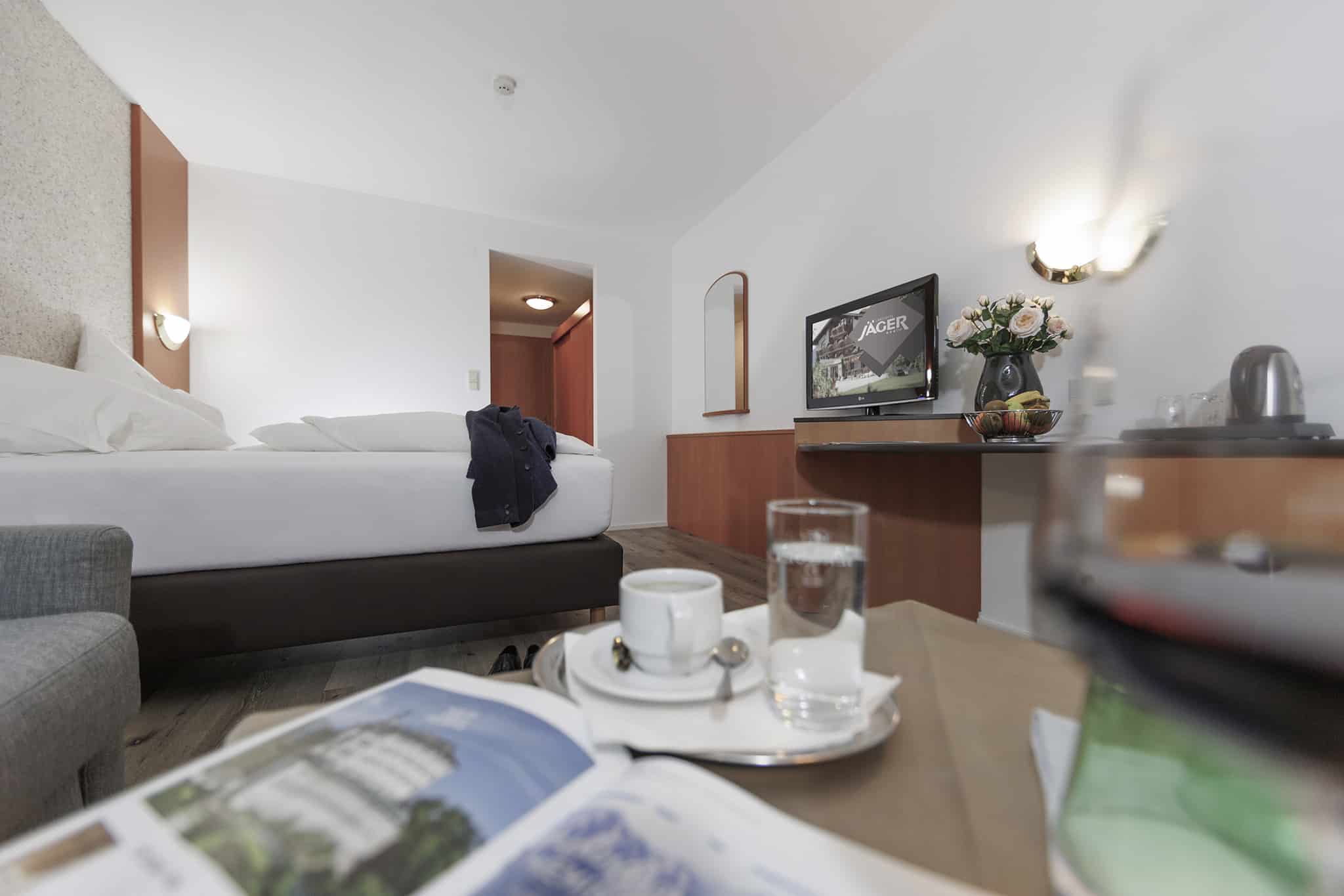 Unser Doppelzimmer bietet einen zurückhaltenden Wohnkomfort, der das Wesentliche in den Vordergrund rückt: die Natur, die majestätischen Berge und eine Atmosphäre der Gemütlichkeit. Hier vereinen sich Holz und Möbelstücke zu einem behaglichen Ambiente, das Sie vom ersten Moment an willkommen heißt. Genießen Sie Ihr Urlaubserlebnis im Landhotel Jäger.